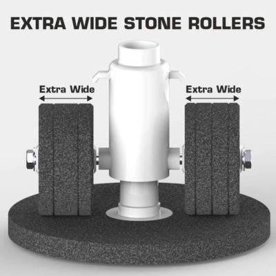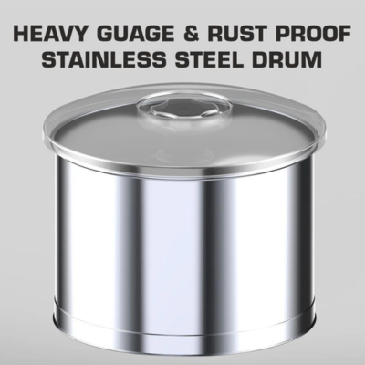 - Heavy Gauge Rust Proof Stainless Steel Drum with Precision Machined Stone Base & Extra Wide Stone Rollers.