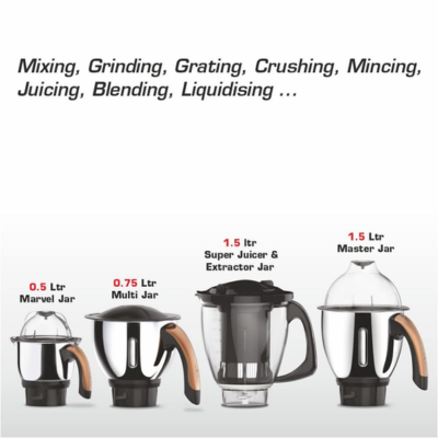 Included Components 1.5 Ltr Master Jar, 1.5 Litre Super Juicer & Extractor, Warranty card, Customer care list, Instruction manual, 0.75 ltr Multi Jar, 0.5 ltr Marvel Jar, Bottom assemblyJar, Bottom assembly