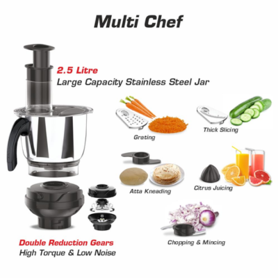 - ✅Vidiem ADC, mixer grinder 750 watt+ - Your All Day Companion Mixing, Grinding, Grating, Crushing, Juicing, Blending, Liquidising, Extracting, Thick & Thin Slicing, Chopping, Mincing, Coconut Grating, Atta Kneading, Citrus Juicing. 2 Litre Stainless Steel Multi Chef with Double reduction Gear Box for High Torque & Low Noise with Polycarbonate Lid.