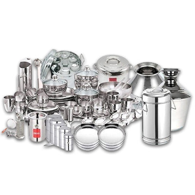 மத்து -1, முறம் -1, பாத்திரக் கூடை -1, டிபன் பாக்ஸ் -2, டிபன் கேரியர் -1, இட்லி குண்டான் -1, ஹாட் பாக்ஸ் -2, ஸ்டீல் ஹாட் பாக்ஸ் -1, வடித் தட்டு -2, பொறியல் தட்டு -6, குழம்பு டப்பா -2, பொறியல் டப்பா -2, எண்ணெய் தூக்கு -1, லெமன் ஸ்பைசர் -1, சோப்பு டப்பா -1, தாலிப்பு கரண்டி -1, பவுடர் டப்பா -1, இடுக்கி -1, அப்பள இடுக்கி -1, முறுக்கு அச்சு -1, சர்க்கரை டப்பா -8, கரண்டிகள் -7, காஃபி பில்டர் -1, டிரம் -1, பவுல் -10, கூஜா -1